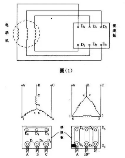 三相异步电动机的三角接法和星型接法区别 (把123看为首,456视为尾,首首相连为Y(星)型接法,首尾相连为角型接法)