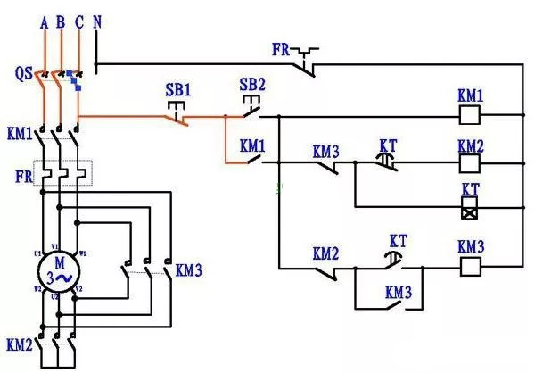 图3,按下启动按钮SB2,从图中红色线可以看出,主接触器KM1吸合,自保。然后,电流同过KM3常闭、KT常闭到星形接触器KM2线圈,KM2吸合,同时时间继电器KT线圈也得电吸合。KM1、KM2吸合将电机接成星形接法,启动。KT吸合开始延时,比如设定延时时间为10秒。