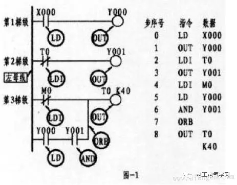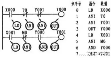 (1) LD(取)、LDI取反)、OUT(输出)指令;LD(取)、LDI(取反)以电工的说法前者是常开、后者为常闭。这二条指令最常用于每条电路的第一个触点(即左母线第一个触点),当然它也可能在电路块与其它并联中的第一个触点中出现。