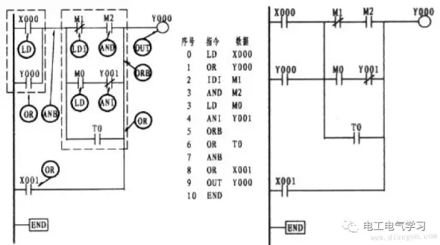 (5) 并联电路块与块之间的串联指令ANB;如左下图虚线框内所示的二电路块相串,各电路块先并好后再用ANB指令进行相串。左图的梯形图可以用右图进行简化。程序的编写如下图所示。ANB指令并无梯形图与数据的显示。可以这样认为;它是形成电路块与电路块之间的串联联接关系,是一条横直线。