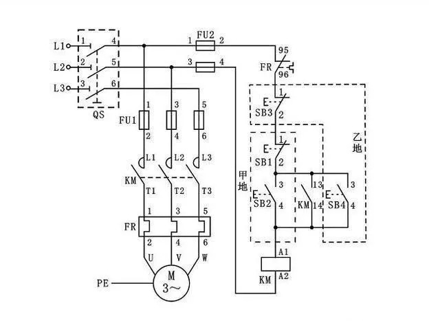 15,三相电动机异地启动控制电路。