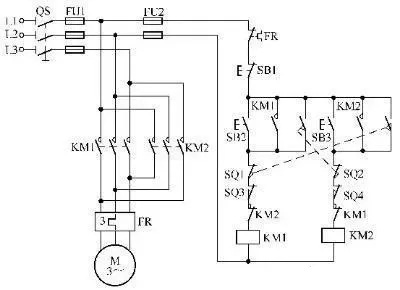 4,三相交流电动机自动往返+过限位保护电路。
