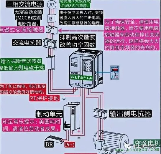 对于功率输出比较大的变频器必须配置这些辅助器件。不同的生产厂家在用户使用指南中都有详细说明。