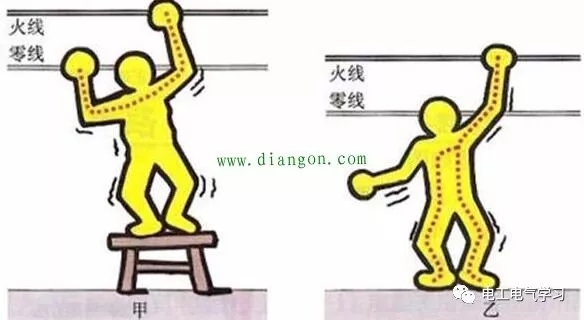 如上图所示,如果人站在木凳上(绝缘体)单独触碰火线和零线是不会触电的,因为没有形成回路。而甲图触电的原因是一手摸火线一手摸零线,人体在中间相当于负载,形成了回路,所以会触电。而乙图单手摸火线,火线和地线之间的电压也是220伏,所以也形成了回路也会触电。那么乙图中如果人站在地上,单手摸零线会触电吗?