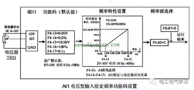 另外看频率特性设置F4-33的AI1曲线选择与F4-13~F4-17 AI1给定与设定值对应关系是否为上图所示的曲线;接下来再看一看变频器的频率源选择F0-03和F0-07的选择是否正确。