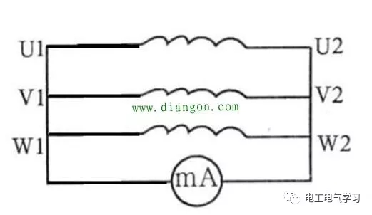 利用这个道理,如果三组线圈的同名端同时接成星形的连接点,这个连接点不会有电动势,串联一个万用表电流档进去,这个万用表并不会有电流流过,也就是万用表的显示电流值为零。如果其中一组同名端弄错了,会造成三相线圈发电过程中,星形连接点会产生电动势,会让一定的电流流过万用表,随便调转某组线圈的两头,一直到让万用表显示的电流为零为止,这时候就可以给每组线圈标注上U1U2V1V2W1W2六个线号。