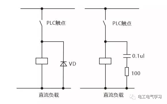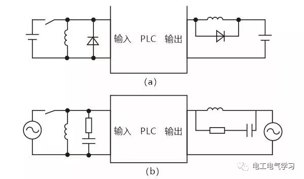 当PLC输入输出端接有感性负载元件时,直流输出的续流管保护(直流电路两端并联续流二极管),交流输出阻容吸收电路。