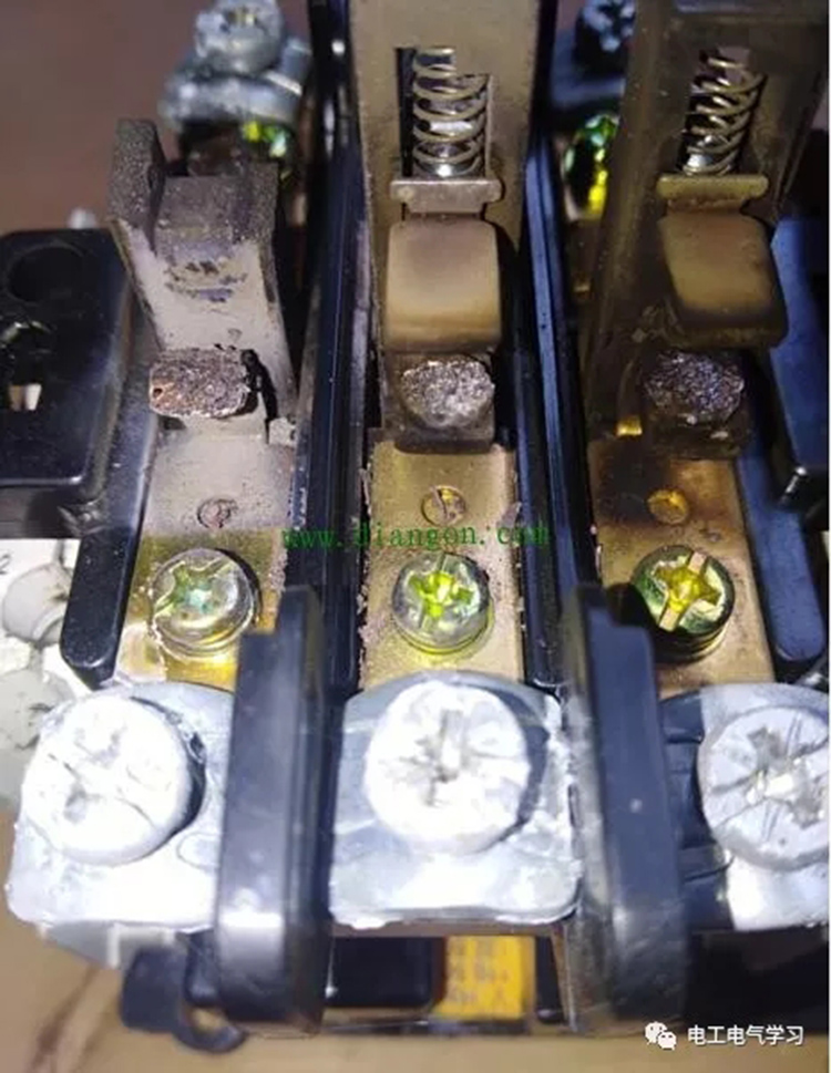 再来说说所谓的热,就是过热,触点过热,引发的损毁故障也比较常见:最常见的原因就是触头接触不良,电经过所有接触不良的地方都会产生热量,所以,触头自身的氧化,粗糙以及积垢都会造成触点过热。第二种情况就是给触头提供开合的外力不足,比如弹簧疲劳电磁吸合力不够,使触头贴合不紧密。diangon.com电工学习网独家原创稿件 版权所有。第三,触头在频繁开合情况下,热量来不及散掉,也会导致触头过热,常启停点动的设备,烧毁触头基本上都是在频繁开合的情况下产生。